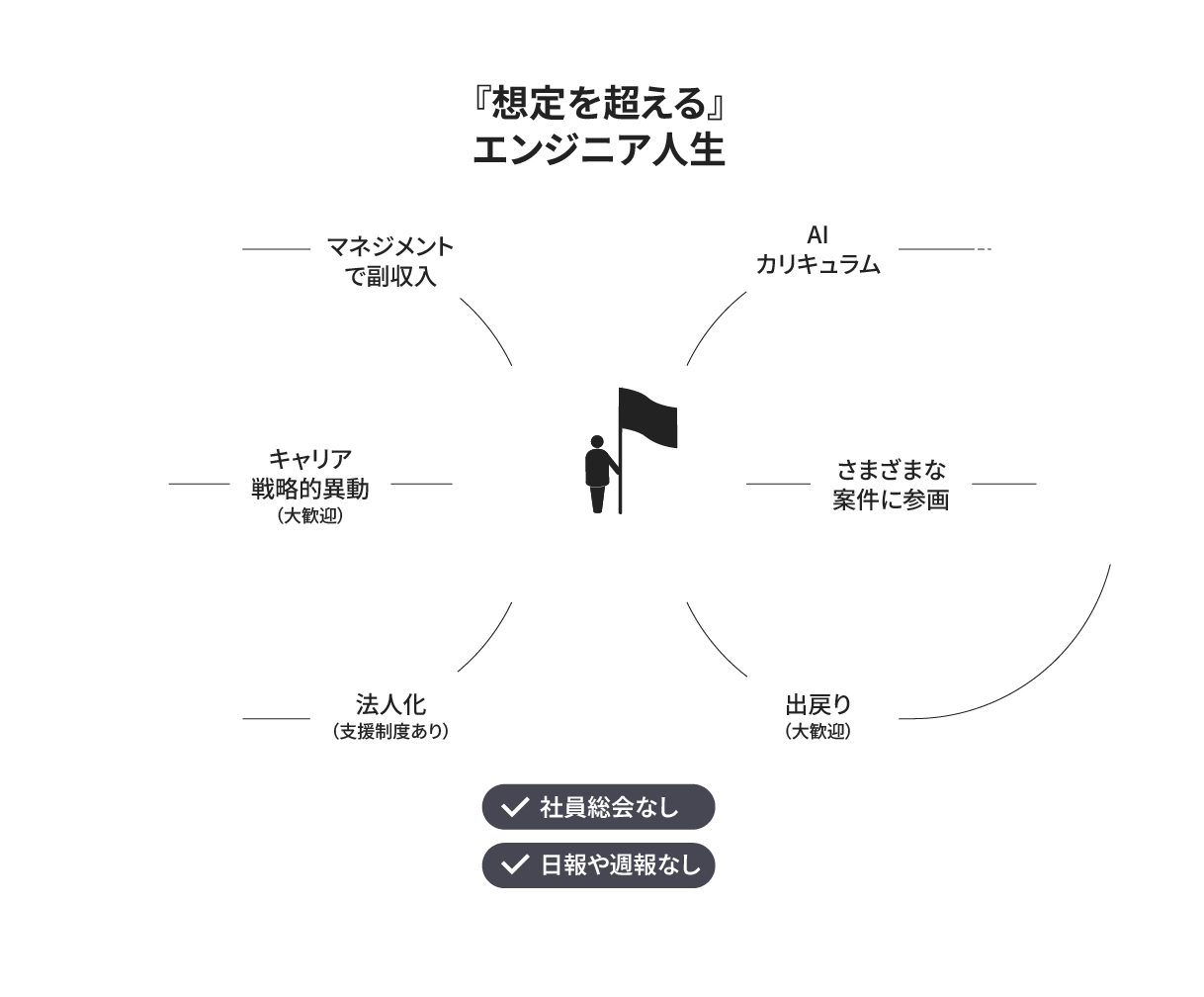 例えば、「法人を立ち上げ、報酬を最大化する(小さなCEO)」「気に入った常駐先で正社員になる」「フリーランスになる」「案件DBの提供/異動も自由」など、自身の想定を超えるキャリアと出会うための多様な選択肢を提供します。