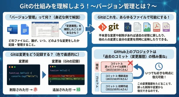 GitHub上のプロジェクトは「過去のコミット(変更履歴)の積み重ね」でできており、もしファイルが誤って削除されたり、意図しない変更が加わってしまった場合でも、この変更履歴をたどることでいつでも好きな時点に復元することができるのです。