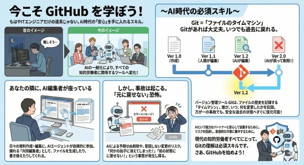 AIが一般化した現在、「Git」と「GitHub」はプログラマーなどのITエンジニアだけのものではなくなったと言えます。