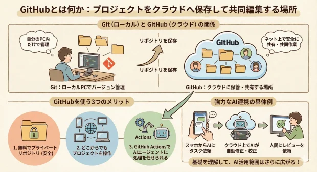 Gitが「ローカルPCでバージョン管理するツール」だとすれば、GitHubは「そのプロジェクトをクラウドに保管・共有する場所」です。