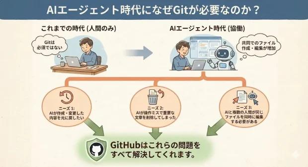 人間が一人で作業を行う場合にはGitは必須ではありませんでした。しかし、これからはAIエージェントが共同でファイルの作成や編集を行うことが増えていくと考えられています。
