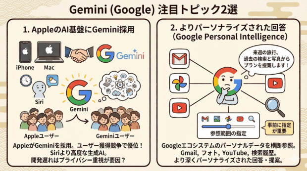 Appleは、iPhoneやMacのAIアシスタントとして、GoogleのGeminiを採用すると発表しました。これにより、GoogleはAppleユーザーをGeminiユーザーとして取り込む形になり、ユーザー獲得競争で大きく優位に立つと見られています。