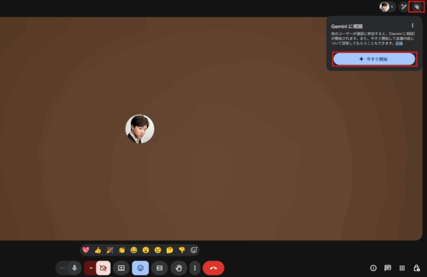 使い方は簡単で、GoogleMeetで会議が始まったら右上のGeminiアイコンをクリックして、「今すぐ開始」をクリックするとGeminiとの会話を呼び出せます。