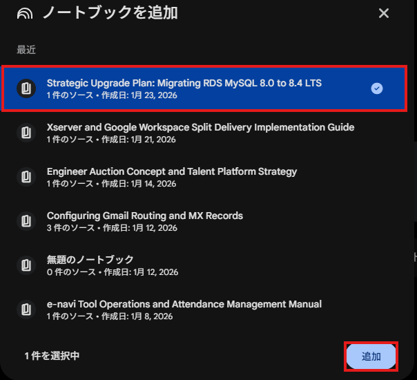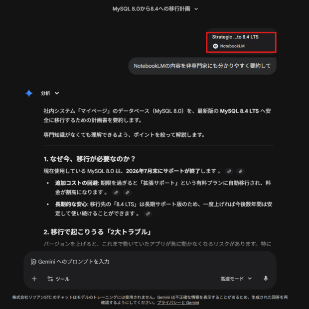 今後はGeminiに依頼を投げる前に、NotebookLMに関連する資料やURLをまとめておくというひと手間を加えることで、より精度の高い回答が期待できるようになるはずです。