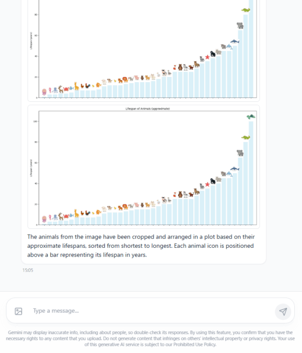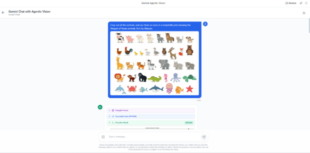 次に、「Act(実行)」で画像の要素を切り取ったり、回転させたりといった操作を行うためのPythonコードを生成して実行します。こうして加工された要素は最終的な出力のためにGeminiのコンテキストに追加されます。