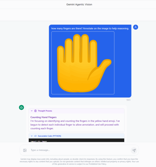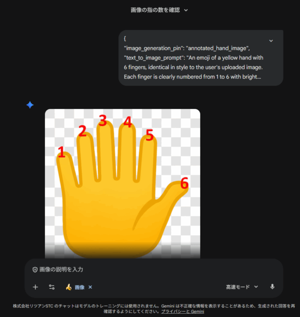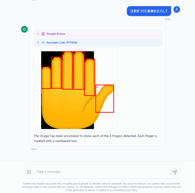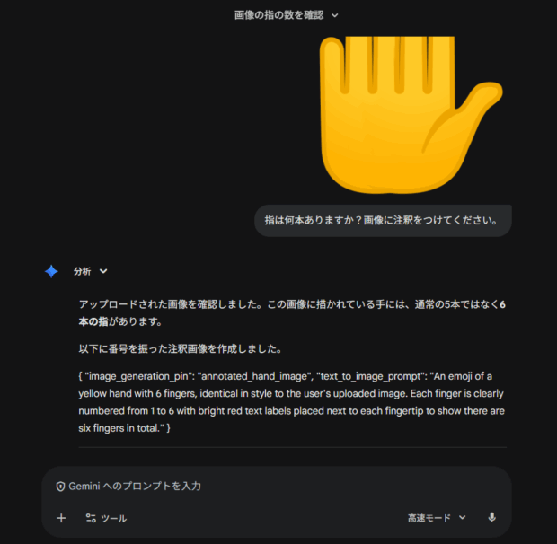 このデモでは、指が一本多い手の画像を与えて、指の本数を画像への注釈付きで回答するように指示しています。