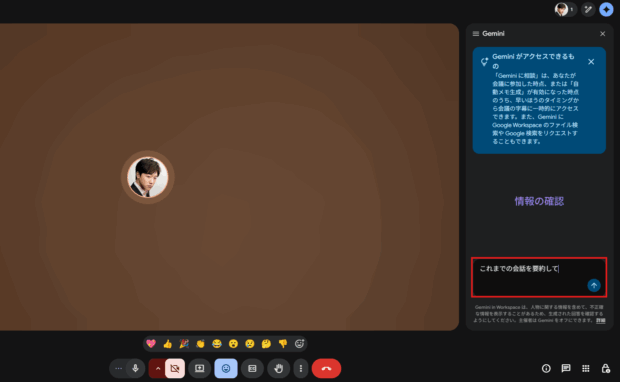 このGeminiとの会話は自分だけに表示されるというところもポイント。会議の流れも止めず、誰の目も気にすることなく、気軽に確認できる相手として重宝してくれるはずです。