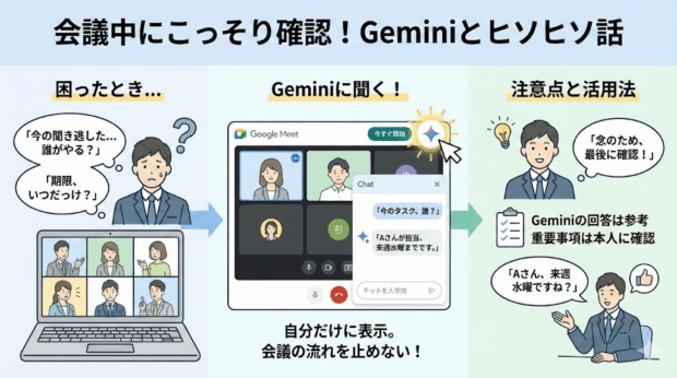 会議中、「今の話、聞き逃しちゃったな…誰が何をやるんだっけ…」とか「さっきの話、思い出せない。期限、何日までって言ってたっけ…」と思ったけど、「流れを切ってまで確認するのもな…」と考えてしまい、言い出せなかったこと、ありませんか?
