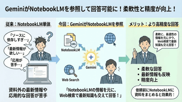 柔軟性の高いGeminiに、NotebookLMを参照して回答してもらうことが可能になりました。これにより、NotebookLMにまとめられた情報を参照しつつ、Web検索やGeminiが学習した知識を交えてより柔軟な回答が可能になります。