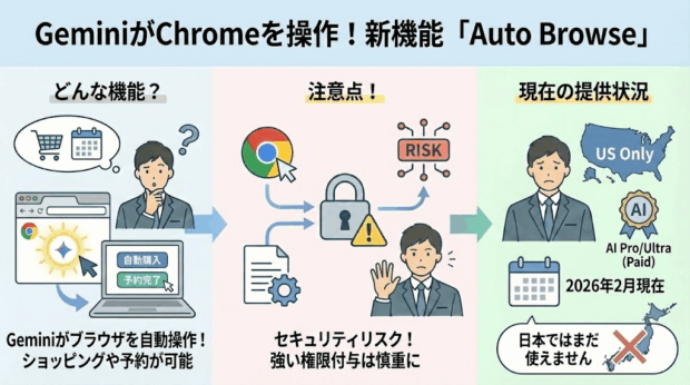 他のAIブラウザ同様、ショッピングや予約など様々な操作が可能ですが、強い権限を与えるということはセキュリティリスクを高めることと隣り合わせなので、注意が必要です。