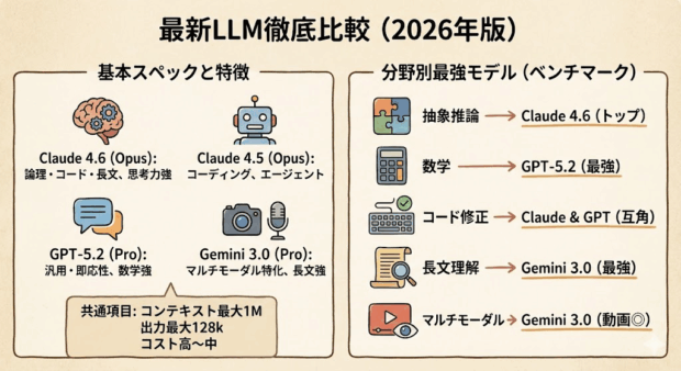 競合モデルと比較すると、数学ではGPTが優秀ですし、長文理解やマルチモーダルではGeminiに軍配が上がります。