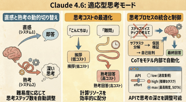 Claude 4.6では、このCoTプロセスがモデル内部に統合されています。つまり、ユーザーが明示的にCoTを指示しなくても、モデルは自発的に問題をサブタスクに分解し、仮説検証を行い、自己批判を経て最終回答を生成するのです