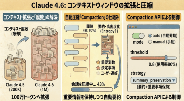 Claude 4.6はこの問題を解決するために、1M(100万)トークンのコンテキストを提供すると同時に、「Compaction」を導入しました。