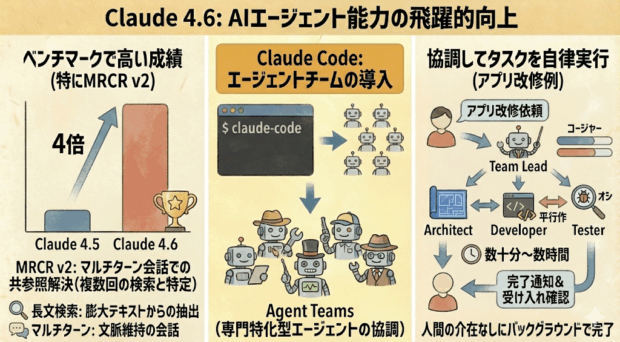 Claude 4.6は思考モードの切り替えとコンテキストの圧縮、階層型チームなどAIエージェントとして複雑かつ長時間のタスクを実行できるように進化しています。
