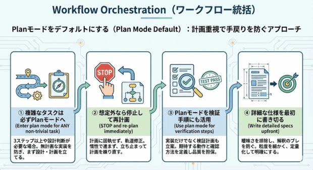 解説:複雑なタスクでは、実装を先に始めると、途中で前提が崩れて「手戻り」が発生するリスクがあります。Planモードは実装に入る前に設計を行い、作業計画を立てるのでこうした失敗を防ぐのに役立ちます。