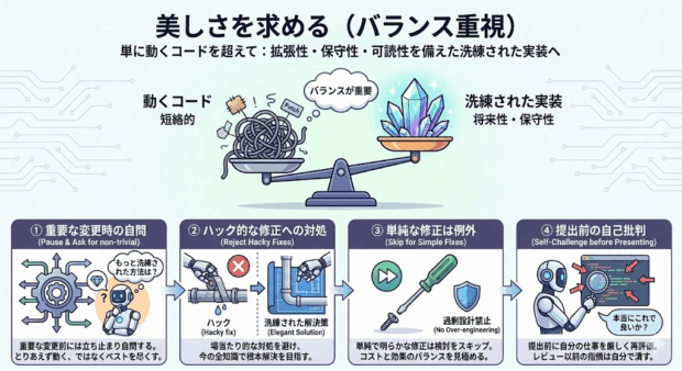 解説 :AIに限らず、複雑な実装をしようとするほど、“とりあえず動けばいい”に寄せてしまいがちです。しかし、将来的な拡張性とか、メンテナンス性とか、現時点でベストを尽くした方がいいことも多々あります。そこで、「今やろうとしている実装は客観的に見て美しいか?」と自己批判させ、美しい実装を心がけるように仕向けます。