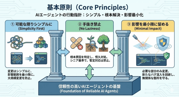 解説 :ここでいう「ハック」とは、目先の課題をクリアするためにやっつけ仕事をする、というニュアンスです。たとえば、根本的な原因を追究せずに例外処理を追加して回避したり、リトライやタイムアウトを増やしたりすることを指します。このような場当たり的な対処を通してしまうと、一見正しく動いているように見えて中身は時限爆弾だらけ、という状態になってしまいます。これもAIエージェント自身に自問自答させることで回避できる可能性が高まります。