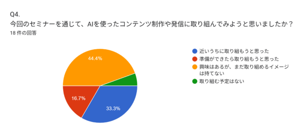 当日は66名の方にご参加いただき、アンケートでも「AIを使ったコンテンツ制作や発信に取り組んでみようと思いましたか?」という設問に対して「近いうちに取り組もうと思った」「準備ができたら取り組もうと思った」と回答した方がちょうど半数に達するなど、運営サイドも含めて大いに刺激を受けました。