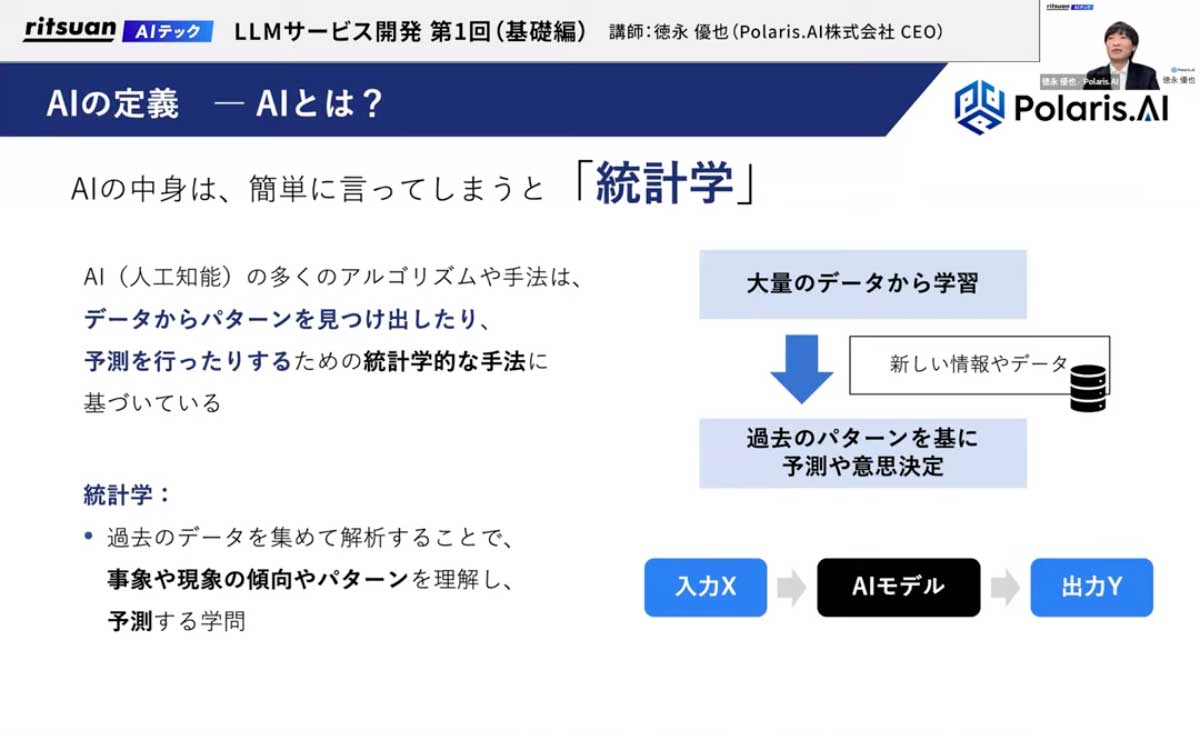 まず、AIの定義ですが、ざっくり言うと「コンピューター空間で人間の脳をどう作るか」という、統計学に近い領域です。人間が経験や情報をもとに次の行動を予測するように、AIも大量のデータから「このインプットの場合はこのアウトプット」という関係を学習し、それらしい結果を出力するモデルです。