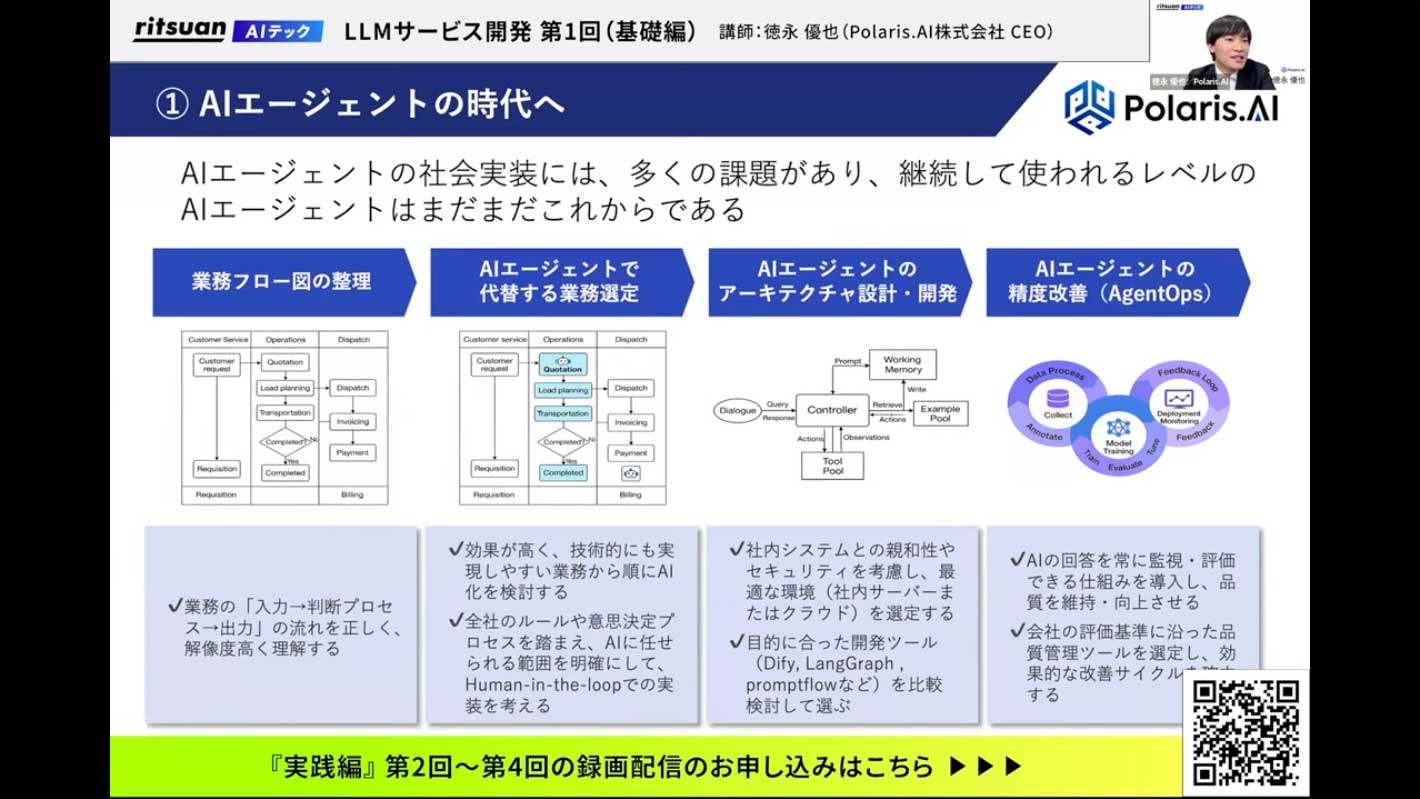 最も重要なのは、AIエージェントの精度改善ループを回すことです。どこで精度が悪くなっているかを評価できるプラットフォームを事前に構築し、運用しながら改善していくことで、実用化につながります。