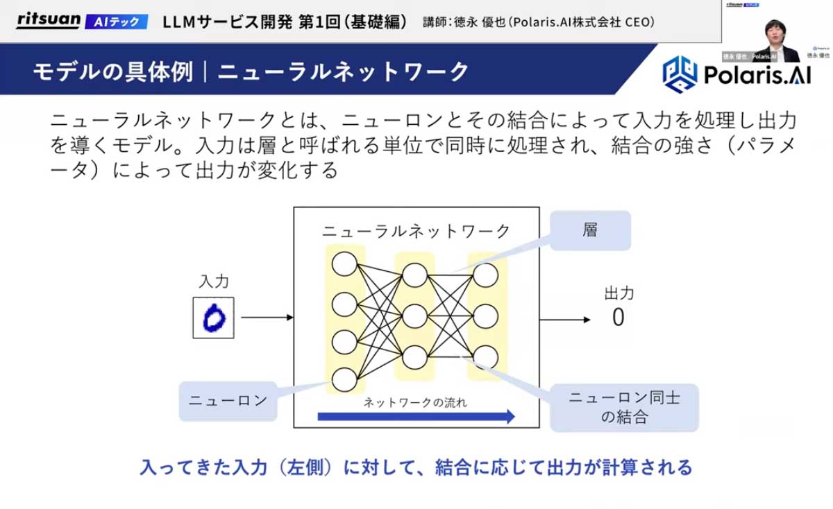 学習とは何かというと、例えば手書き文字認識タスクの場合、手書き文字とそれがどの数字であるかという正解(ラベル)のデータを大量に与えて学習させます。すると、モデルが手書きの「0」が入力された際に、デジタルの「0」を出力できるようになります。モデルとは、ニューラルネットワークの様々な層が重なったものだと想像してください。