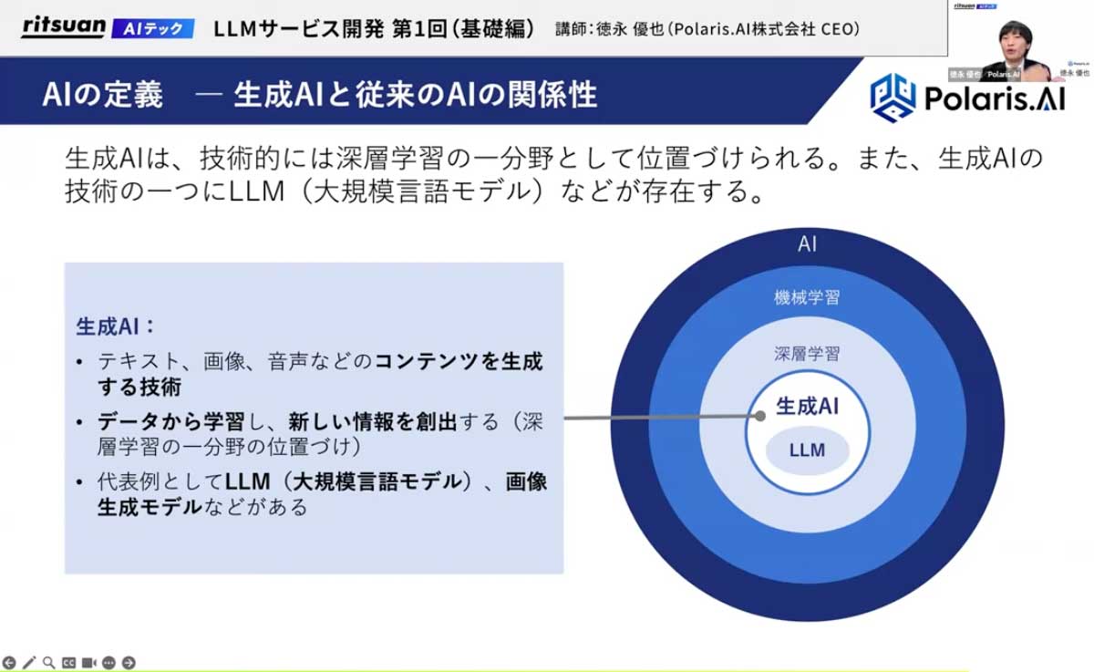 - 生成AI:深層学習の一部で、新しいデータを生成するAI。音声、画像、自然言語などがある。