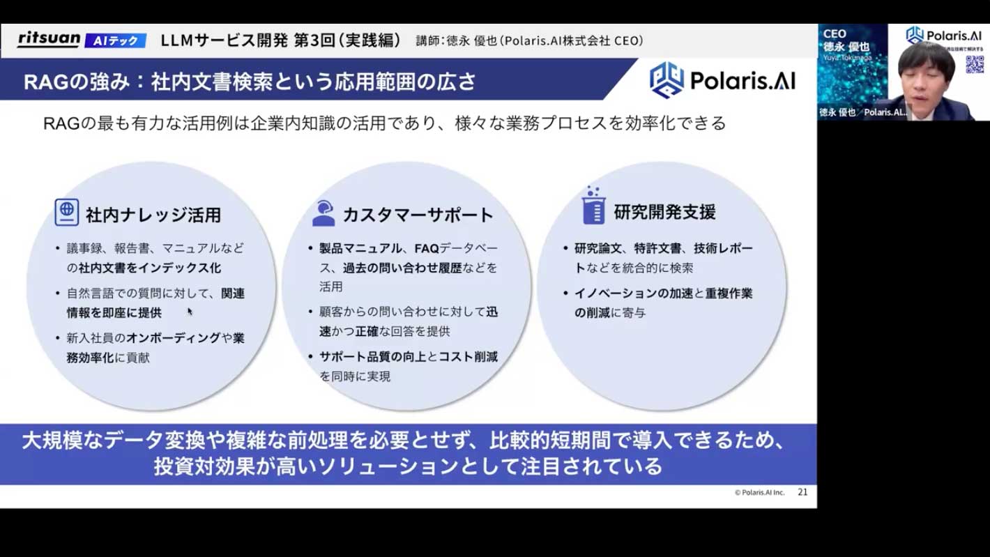 何が言いたいかというと、昨今よく使われているツールのほとんどは、RAGを応用したものである、ということです。それぐらい、RAGは応用範囲の広い技術であり、弊社が受託する案件の中でも、ニーズの高さは一、二を争う技術分野です。