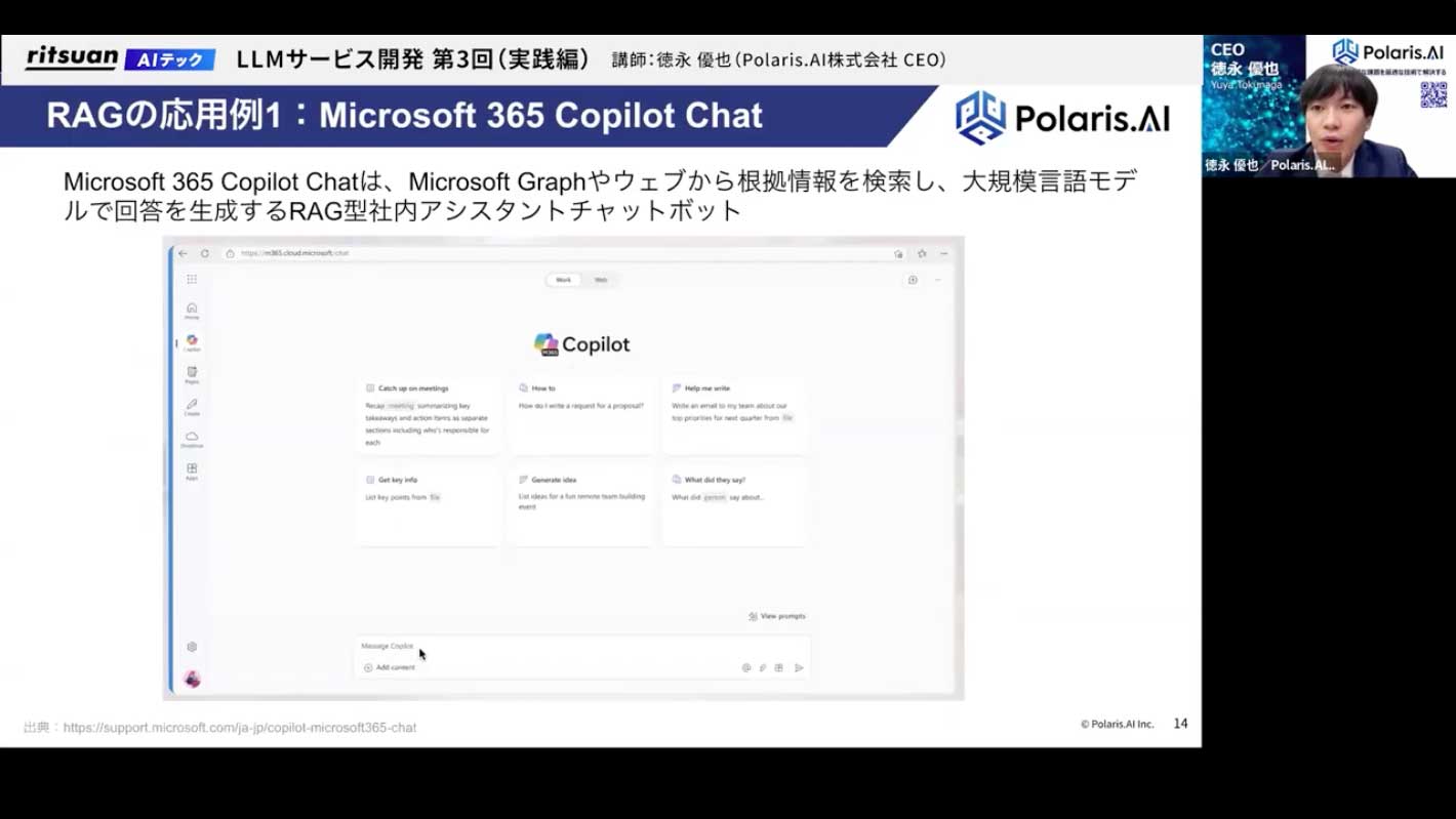 よくあるユースケースとしては、Microsoft 365 Copilotが有名です。導入されている会社も多いかと思いますが、チャット形式で様々な質問に答えてくれます。これは、連携された社内情報やウェブ上の情報を基に応答しており、まさにRAG技術を応用したチャットボットです。