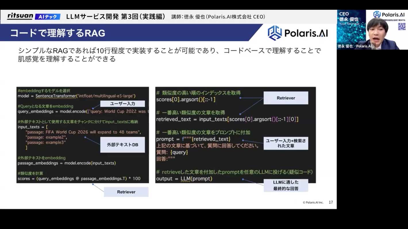 これはミニマムなRAGのコード例ですが、わずか10行程度で表現できてしまいます。