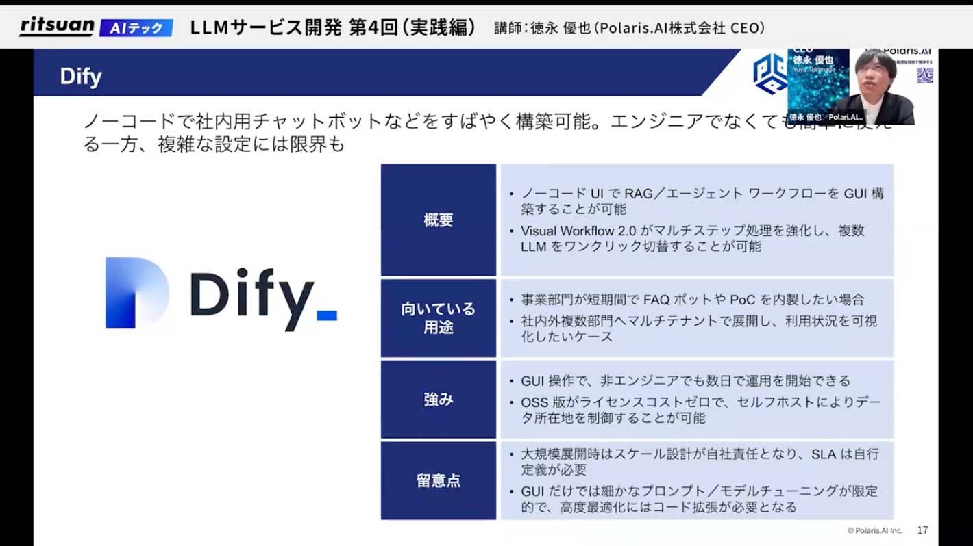 試行フェーズ: まず短期間でRAGを試したい場合は、DifyなどのSaaSが適しています。