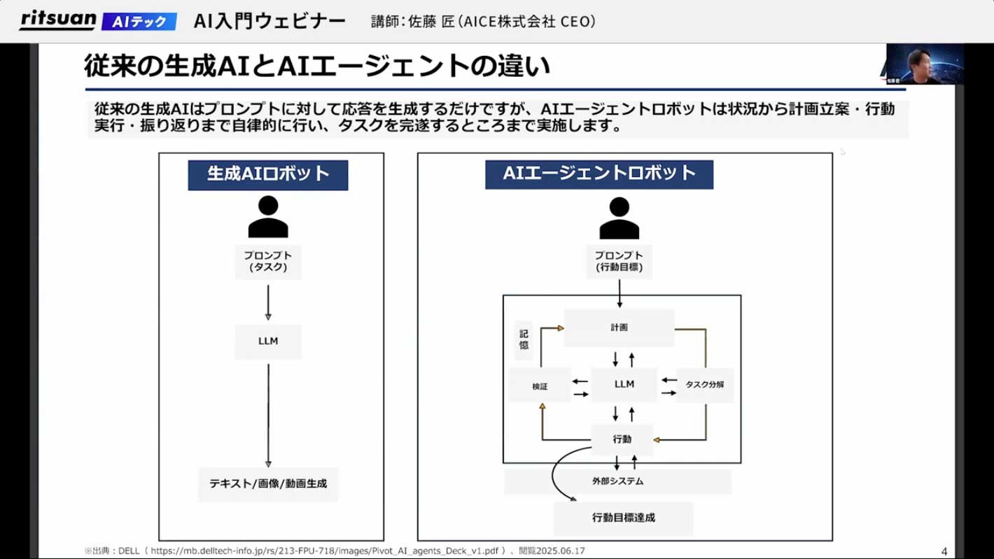 本日は初級編という形で、AIエージェントがどういう仕組みになっているのかに簡単に触れさせていただいた後、実際にAIを活用している企業がどのようなサービスをどのように使っているのかを解説します。このウェビナーに参加していただいた方が、「明日からこれを使ってみよう」と思えるような内容をメインにお話しさせていただければと思いますので、よろしくお願いいたします。