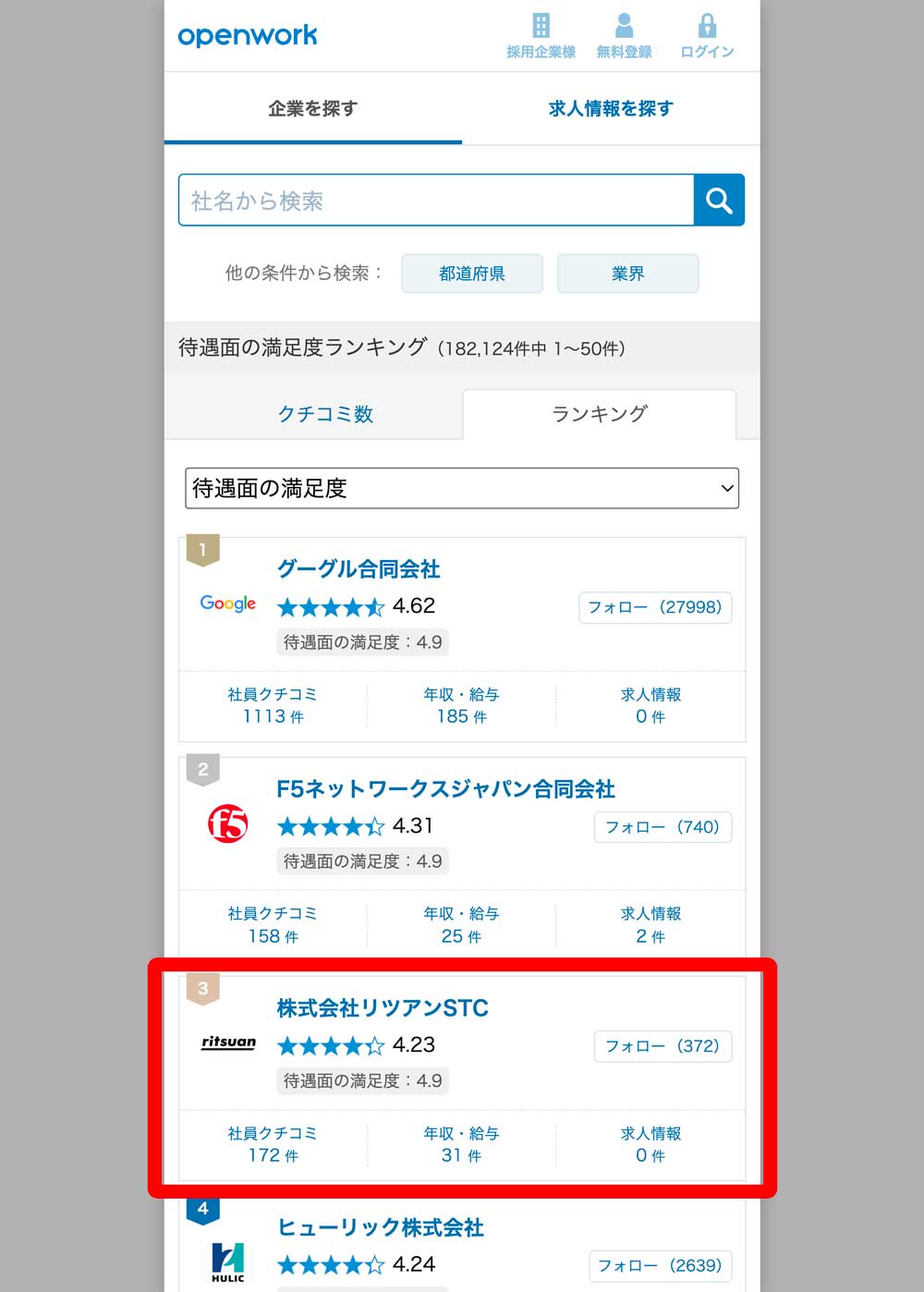 言わずと知れた転職口コミサイト“OpenWork”に登録されている全ての企業18万社くらいのうち、3位です。
