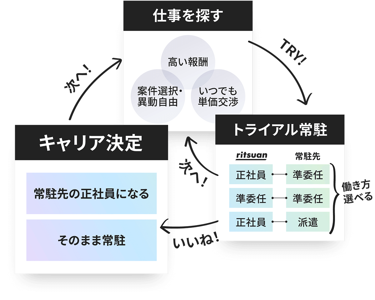 リツアンは、1人1人がキャリアプランに最適な選択ができるよう、さまざまな働き方の選択肢を用意しています。