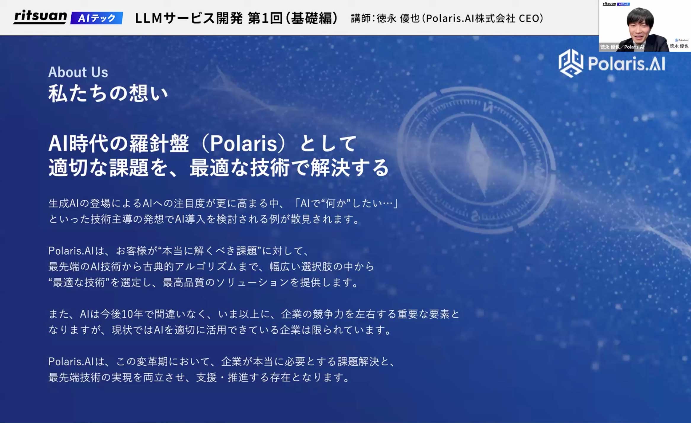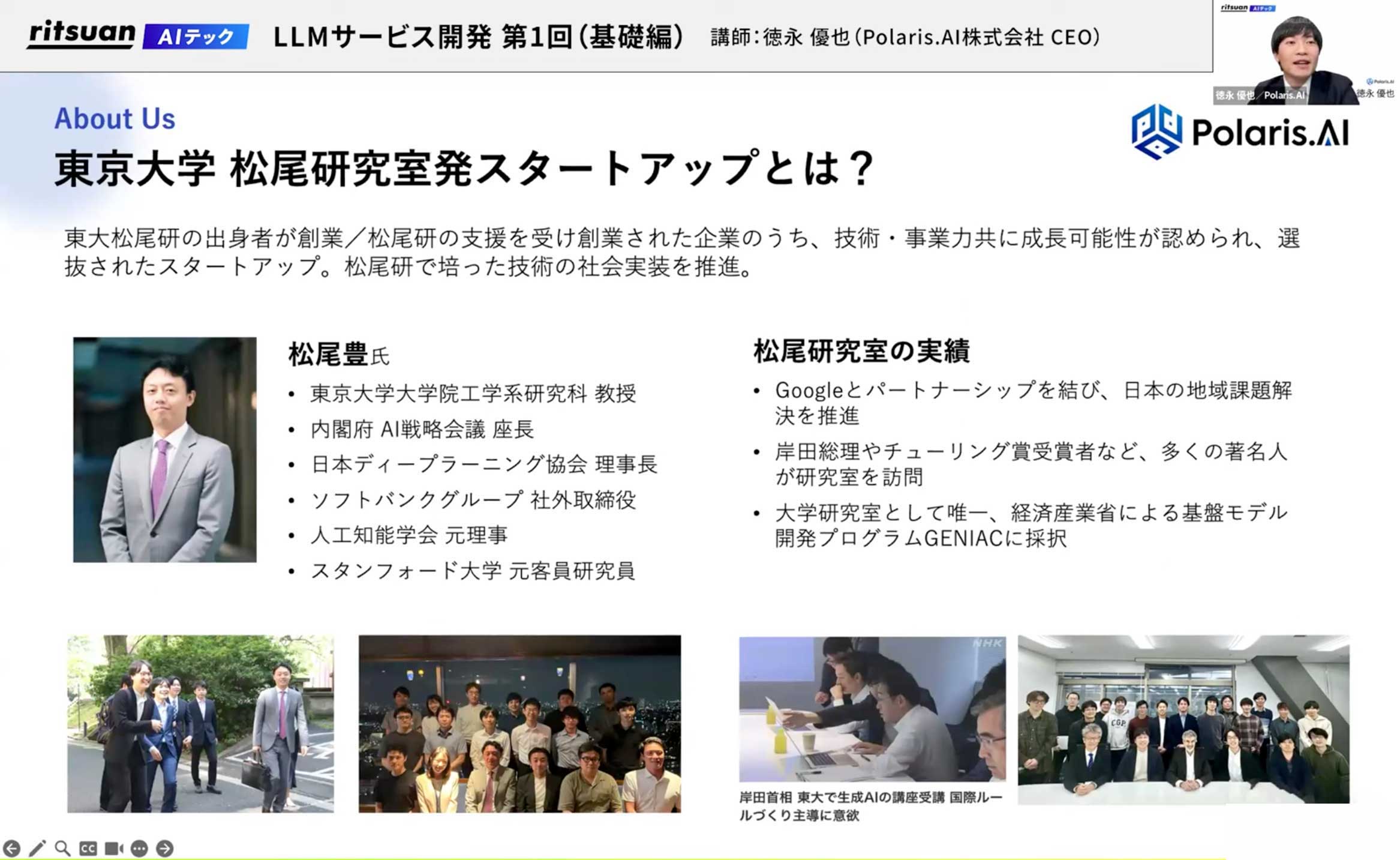 Polaris AIは東京大学松尾研究室からスピンアウトした会社で、約40名で事業を行っています。