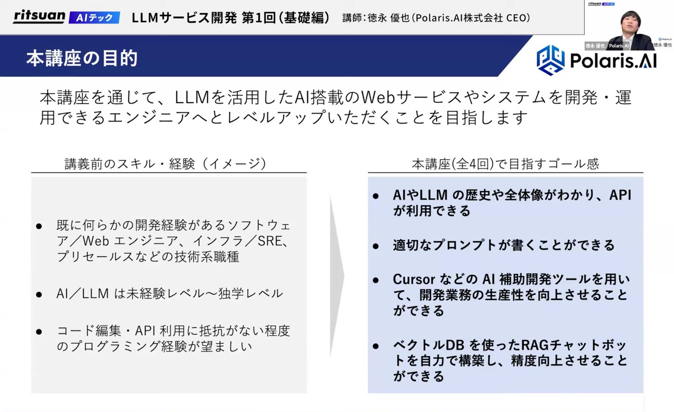 今回の講座の目的についてお話しします。対象は、エンジニア経験がある方や、AI・LLMに未経験または独学で触れたことがある方です。