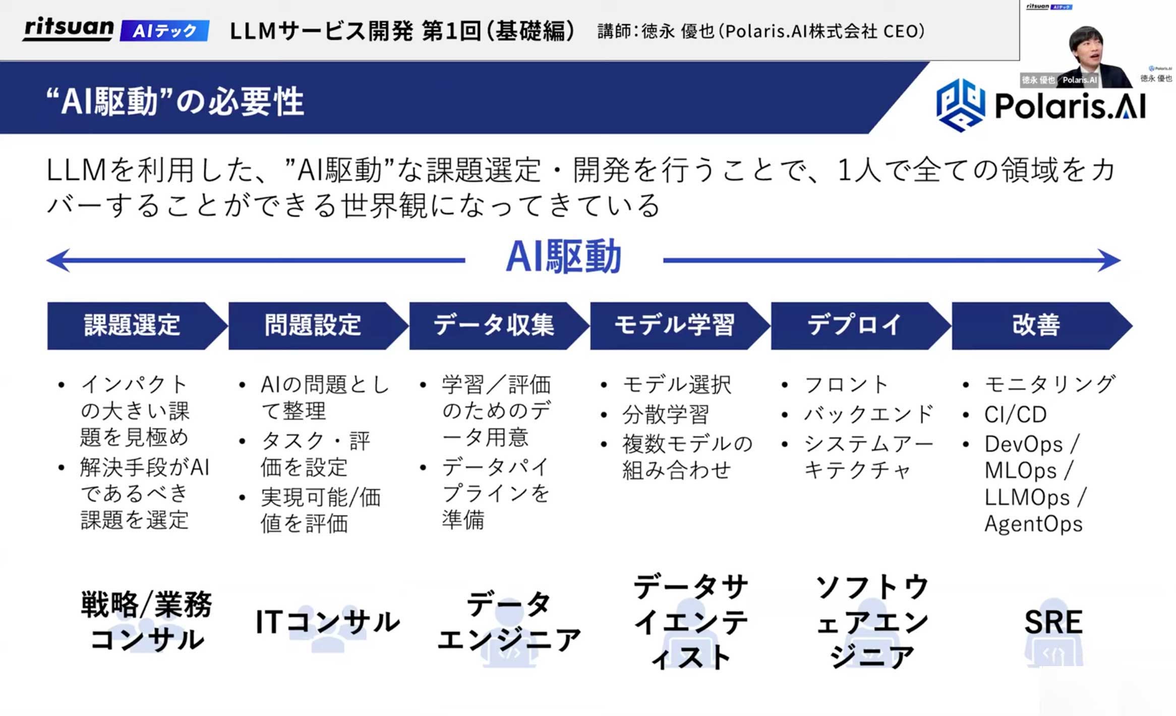 なぜAI駆動開発を第2回に入れているかというと、AIツールやエージェントを用いた開発は、生産性を格段に向上させるからです。私自身もエンジニア歴はそこそこ長いですが、ここ3年ほどでDevin、Cursor、ChatGPTなどのLLMが登場し、開発の生産性(特に小規模アプリケーションのレベル感では)が5倍以上になっていると感じています。これはモデル学習やデプロイのWeb開発に限らず、課題選定からデータ収集まであらゆる場面で活用できる技術です。非常に重要な技術として、第2回で時間を取って深く掘り下げていきます。