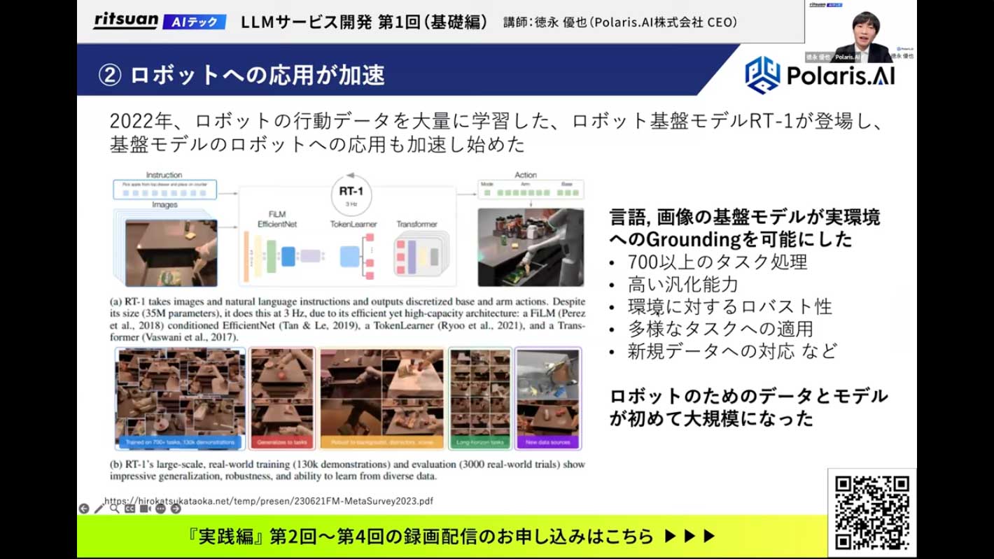 ロボット基盤モデルの登場により、自然言語処理におけるChatGPTのように、大量のデータを学習させることで、ロボットも汎用的なタスクをエンドツーエンドで実行できるようになり、数年で社会実装が進むと期待されています。