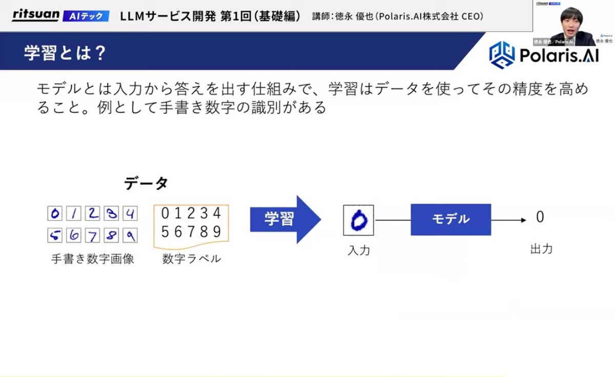 学習とは何かというと、例えば手書き文字認識タスクの場合、手書き文字とそれがどの数字であるかという正解(ラベル)のデータを大量に与えて学習させます。すると、モデルが手書きの「0」が入力された際に、デジタルの「0」を出力できるようになります。モデルとは、ニューラルネットワークの様々な層が重なったものだと想像してください。