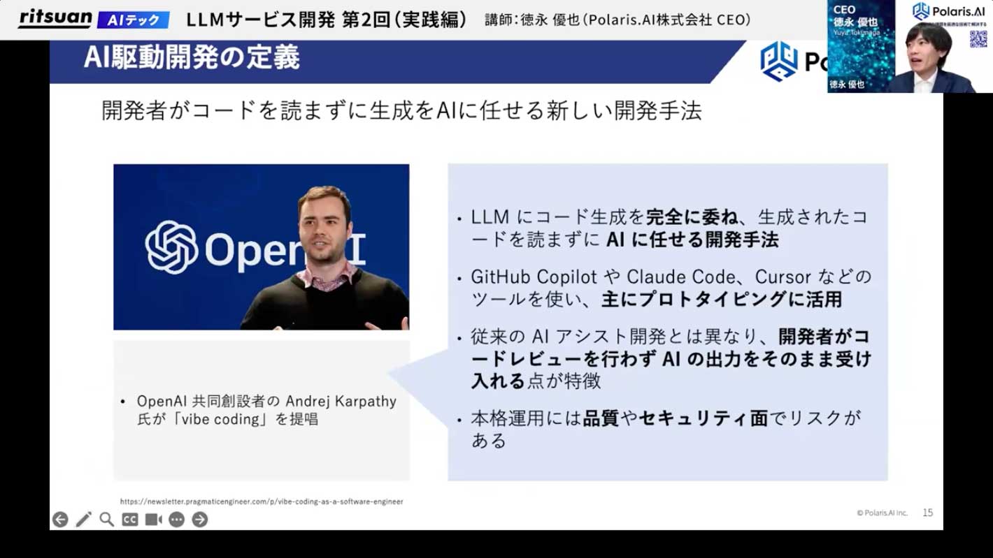 AI駆動開発は「Vibe Cording」とも呼ばれ、LLMにコード生成を委ねてAIに開発を任せるという考え方で、OpenAIの共同創設者が最初に提唱した概念です。