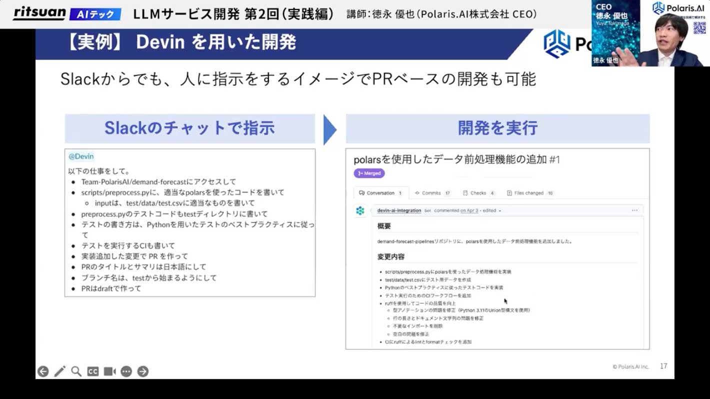 イメージとしては、例えばCursorというAIエディタで「Webブラウザで動作するToDoアプリを作って」と一行入力してボタンを押すと、コードが生成され、実行すると実際に操作できるフロントエンドアプリが完成します。また、DevinというAI支援ツールでは、「このリポジトリにアクセスして、こういうコードを書いて」と大まかに指示するだけで、DevinがGitHub上でプルリクエストを作成してくれます。