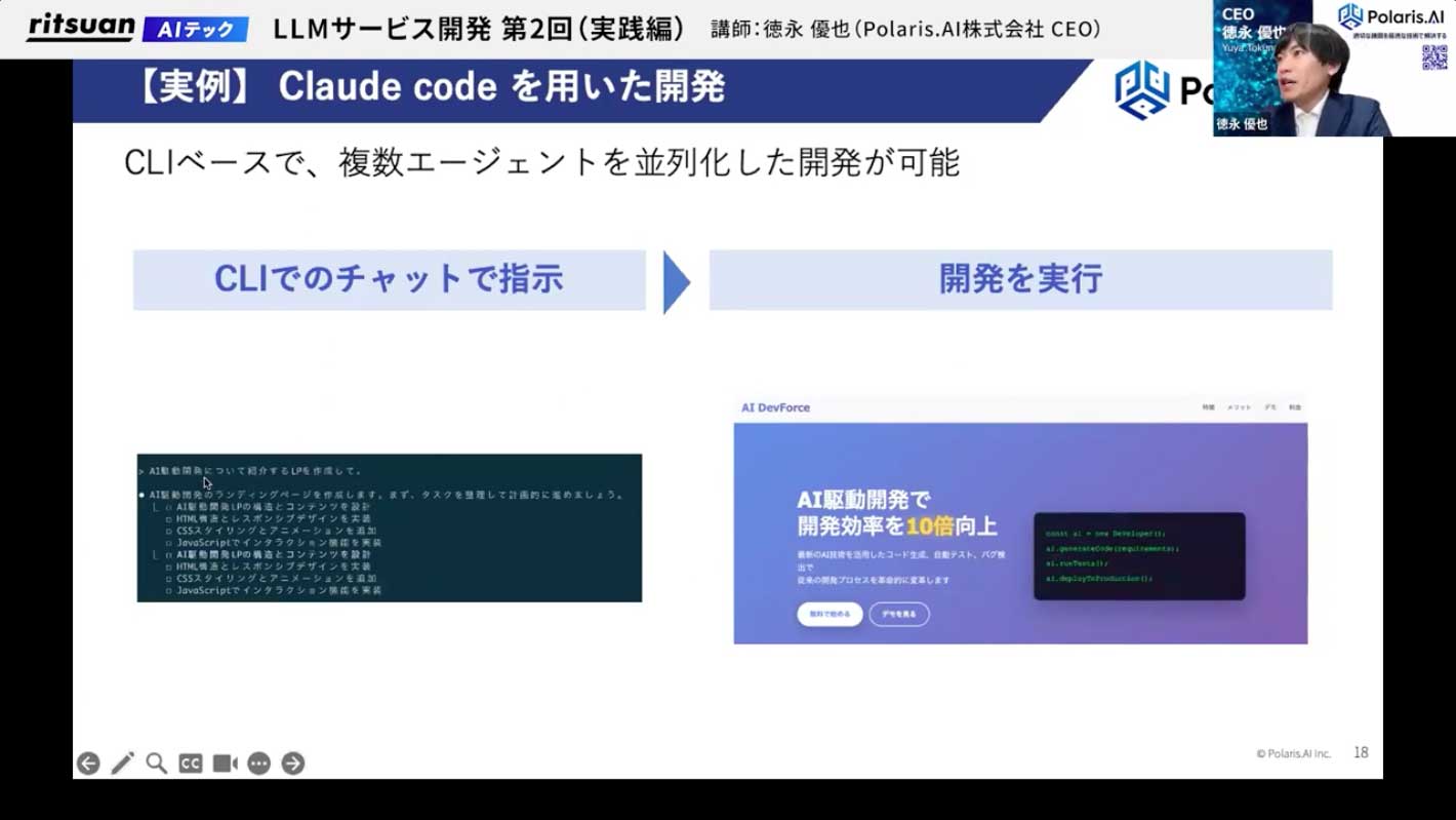 さらに、最近流行しているClaude Codeでは、「AI駆動開発について紹介するランディングページを作成して」と一行入れるだけで、ToDoリストを整理し、デザイン性の高いページを自動で生成してくれます。