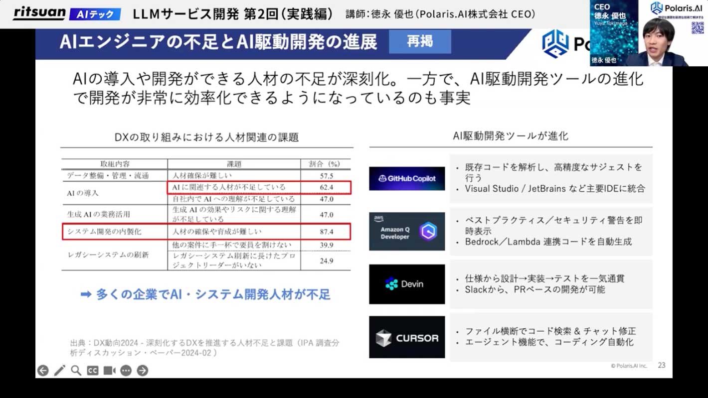 特にClaudeやGPT-4以降、コード生成の精度が格段に上がり、人間のようなコードが書けるようになりました。また、人材不足という背景や、優れたツールが登場したことで、「これらを使えば生産性が上がるのではないか」と試した結果、実際に効果が高かったため、流行してきたのだと思います。