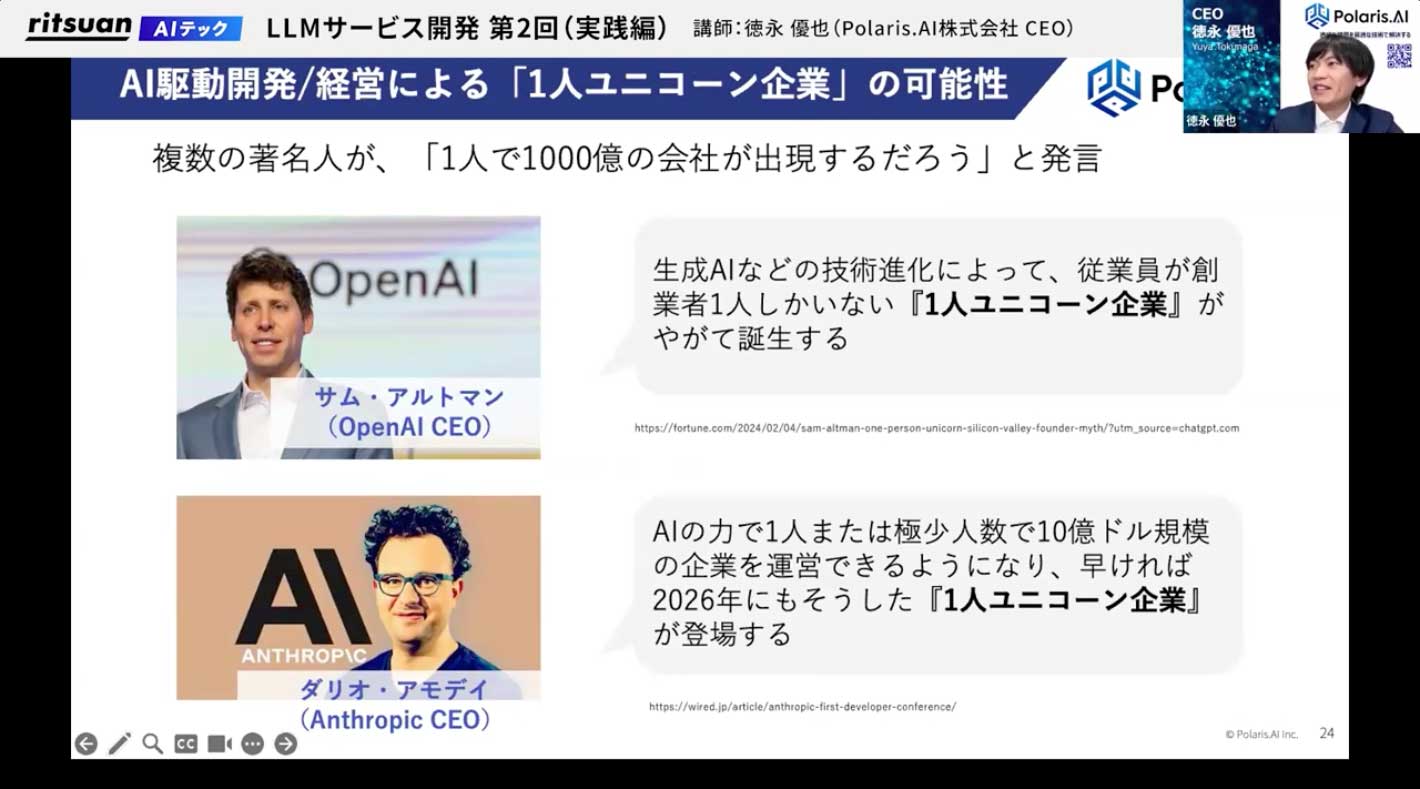 これは、従来大規模なプロダクト開発に多くの人と時間が必要だったものが、全体を理解している一人の人間がAIエージェントを駆使することで、短期間で実現可能になるという考えに基づいています。実際に、Devinを開発しているCognition Labsは、約70名で時価総額6000億円、Cursorを開発している会社も約70名で時価総額1兆4000億円に達しており、少人数でもAIを活用して巨大な価値を生み出す事例が現れています。