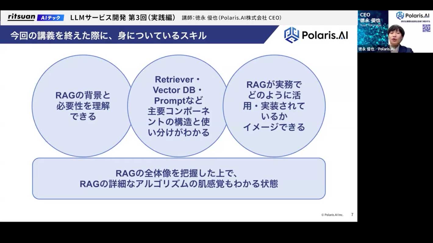 今回の講義を終えた際に身についているスキルとしては、第一回でも軽く触れましたが、RAGが昨今なぜ求められているのかという背景や必要性をさらに深く理解できる状態を目指します。