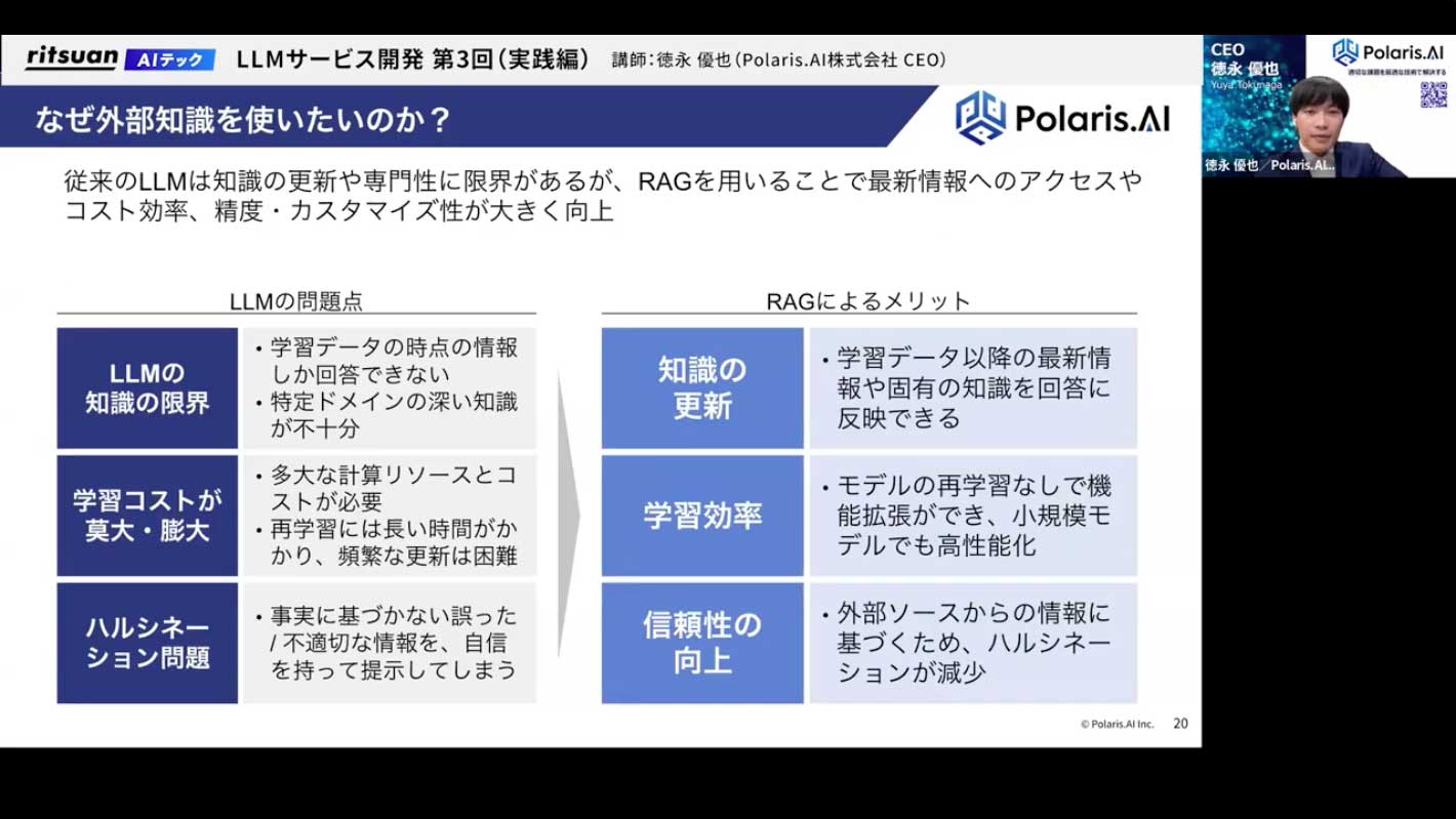 では、なぜ外部知識を使いたいのか、RAGを使うと何が良いのかを深掘りします。
