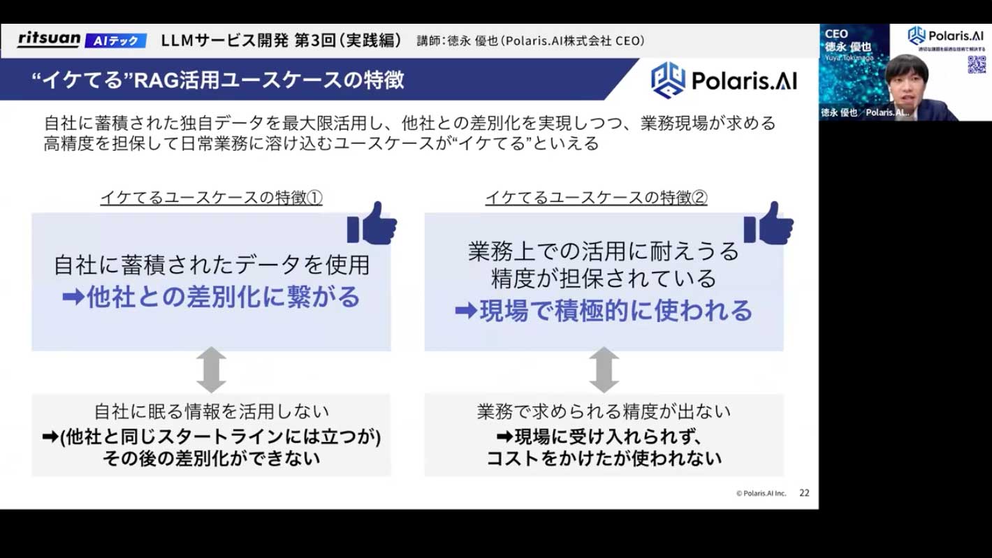 特に、社内に蓄積された独自のデータをきちんと整理し、RAGに活用することで、属人化していた知識を誰もが自然言語で引き出せるようになり、業務の省人化に大きく貢献します。ただし、そのためにはデータをきちんと整理し、精度を上げていくことが非常に重要です。