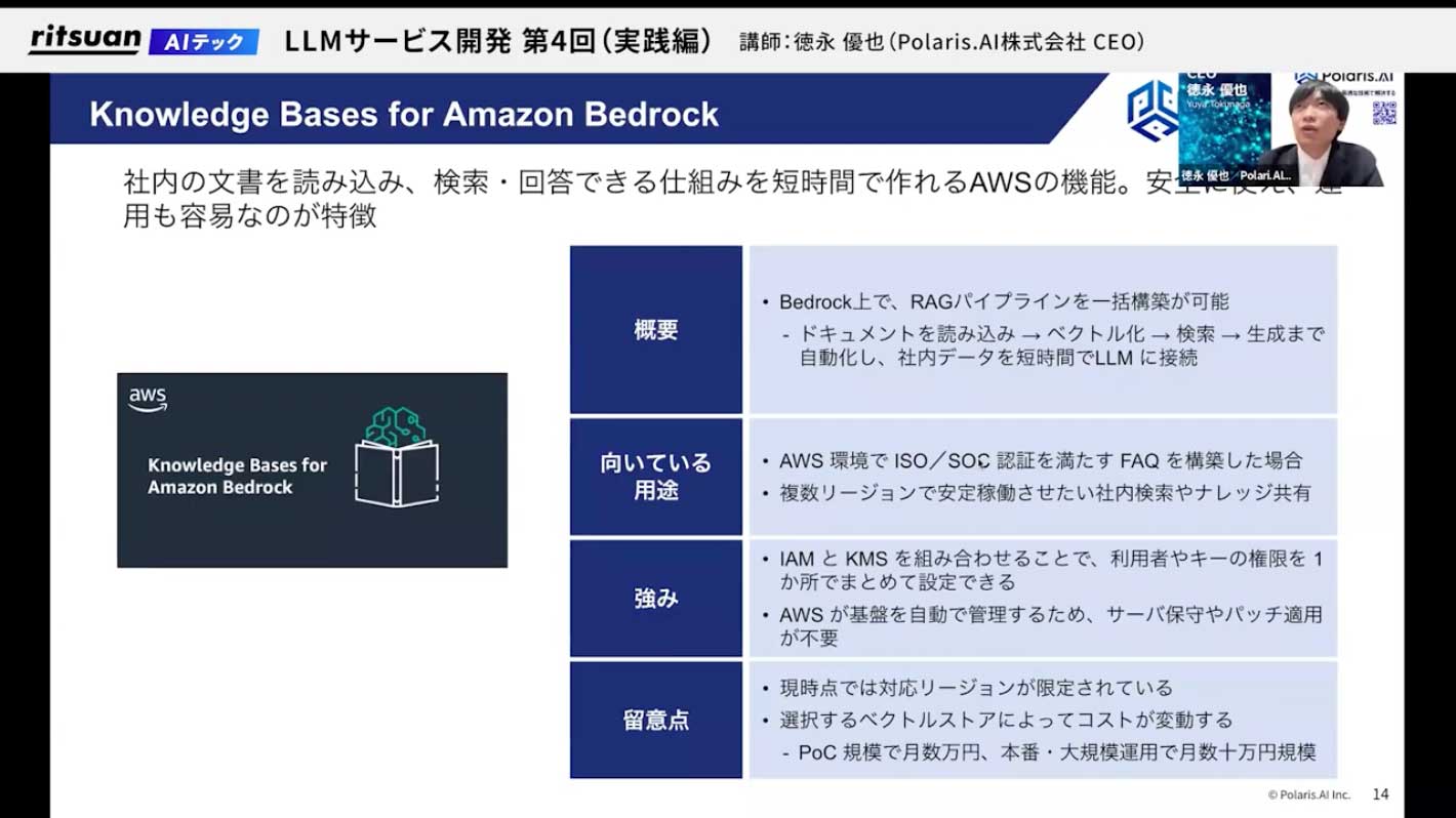 Amazon Web Services (AWS): Amazon Kendra や Amazon Bedrock の Knowledge Bases といったサービスがあります。これらも同様に、AWS上のデータベースと連携して簡単にRAGを構築できます。