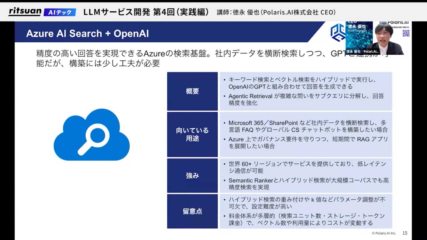 Microsoft Azure: Azure AI Search というマネージドな検索サービスがあります。マネージドサービスとは、私たちがエンベディングモデルを選んだり、類似度計算の関数を実装したりする手間なく、検索対象のドキュメントをデータベースに入れておけば、質問に近いドキュメントを自動的にいい感じで検索してくれるサービスです。