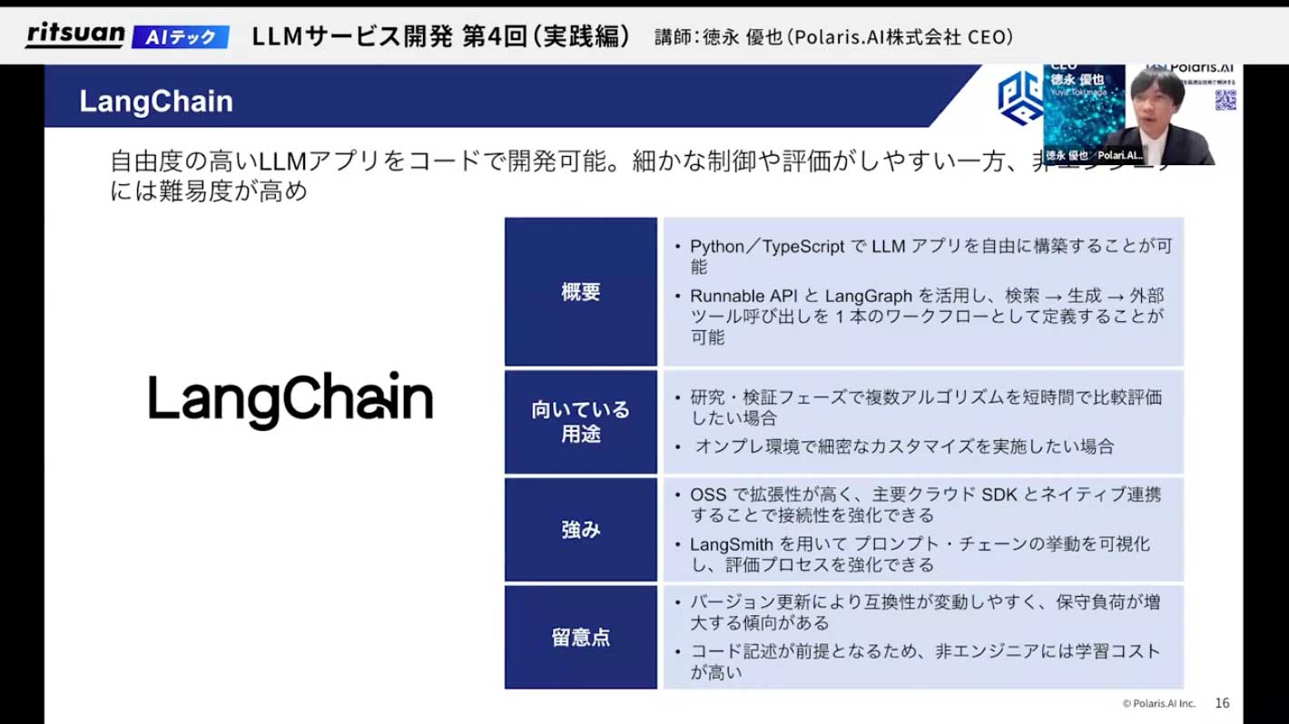 高度な精度向上フェーズ: それでも精度が足りない場合は、オンプレミスでLangChainなどのライブラリを使い、一から独自にカスタマイズしていく、という流れが一般的です。