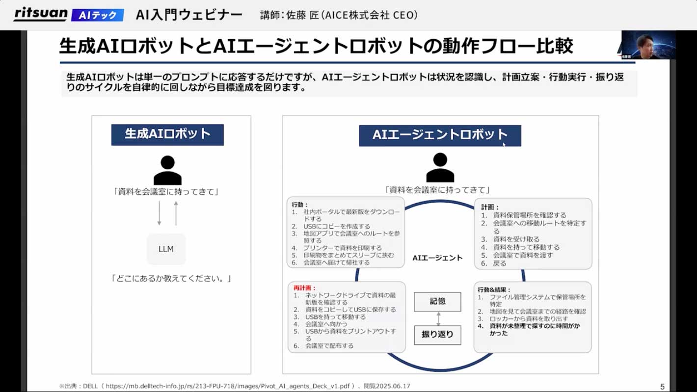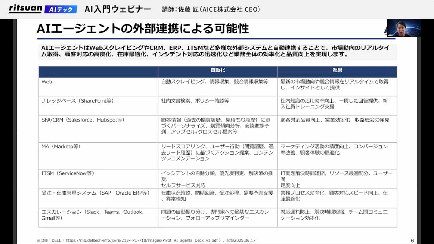 本日は初級編という形で、AIエージェントがどういう仕組みになっているのかに簡単に触れさせていただいた後、実際にAIを活用している企業がどのようなサービスをどのように使っているのかを解説します。このウェビナーに参加していただいた方が、「明日からこれを使ってみよう」と思えるような内容をメインにお話しさせていただければと思いますので、よろしくお願いいたします。